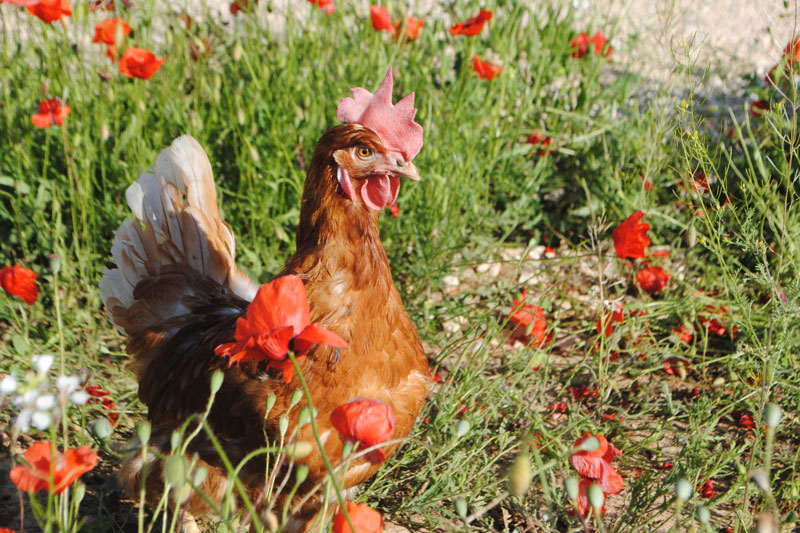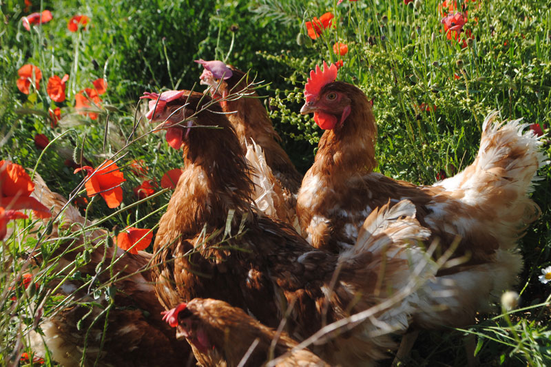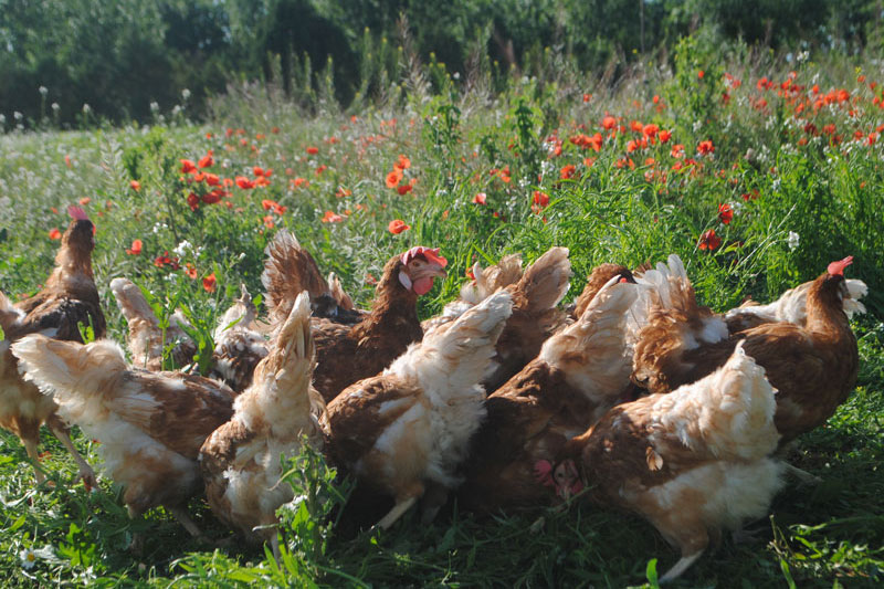 Cuidamos con cariño a nuestras gallinas dándoles una alimentación basada en maíz, además de lo picotean en el prado, y asegurando su bienestar mediante el cuidado de un entorno donde pastan