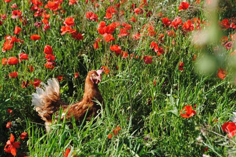 La Alimentación de nuestras gallinas está basada en el maíz, con piensos 100% naturales, con la certificación de Calicer “Certificadores de Calidad S.L”. Además de lo que les aporta lo que ellas mismas picotean en el prado en el que pastan